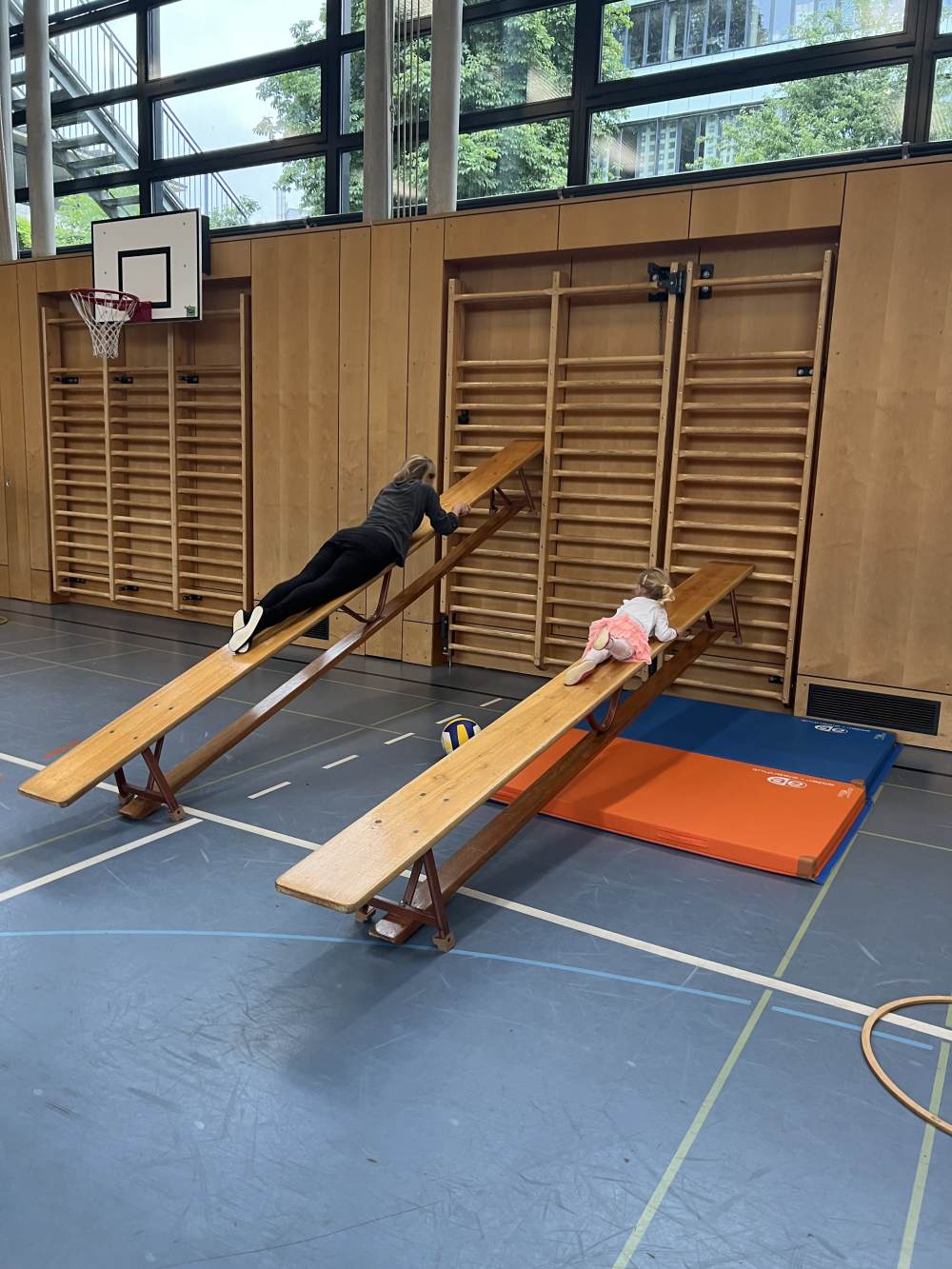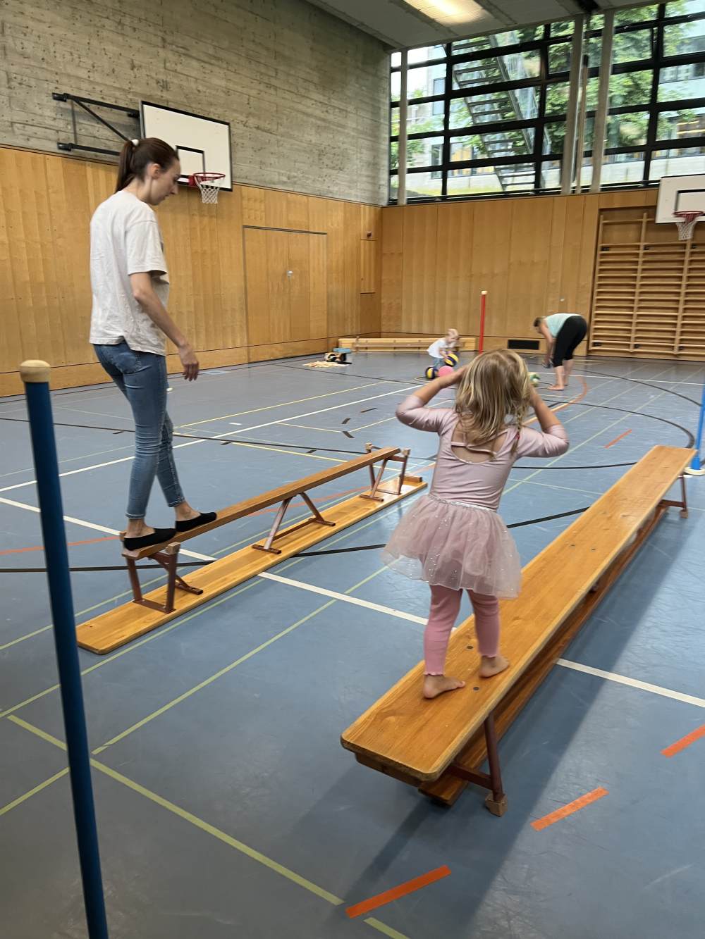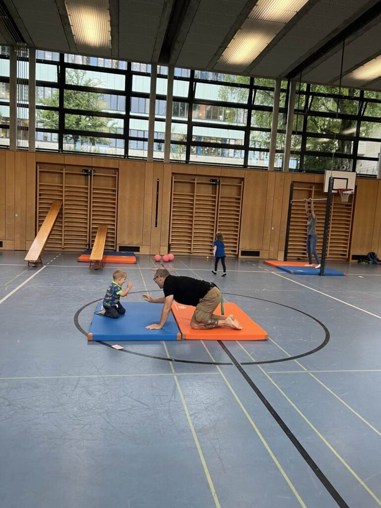 Im Alter zwischen zweiundhalb und bis zum Kindergarteneintritt können Mädchen und Buben bei uns zusammen mit einem Eltern- oder Grosselternteil, dem Götti oder der Gotte einmal wöchentlich eine Lektion turnen.